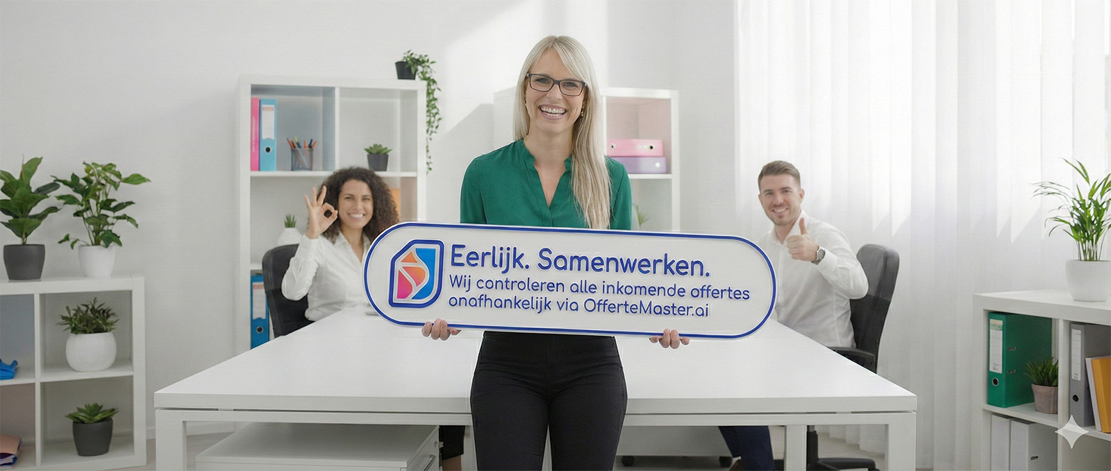 Organisaties die het Eerlijk. Samenwerken. Label voeren en actief communiceren dat alle inkomende offertes objectief worden gecontroleerd via OfferteMaster.ai, creëren een duidelijke preventieve werking.